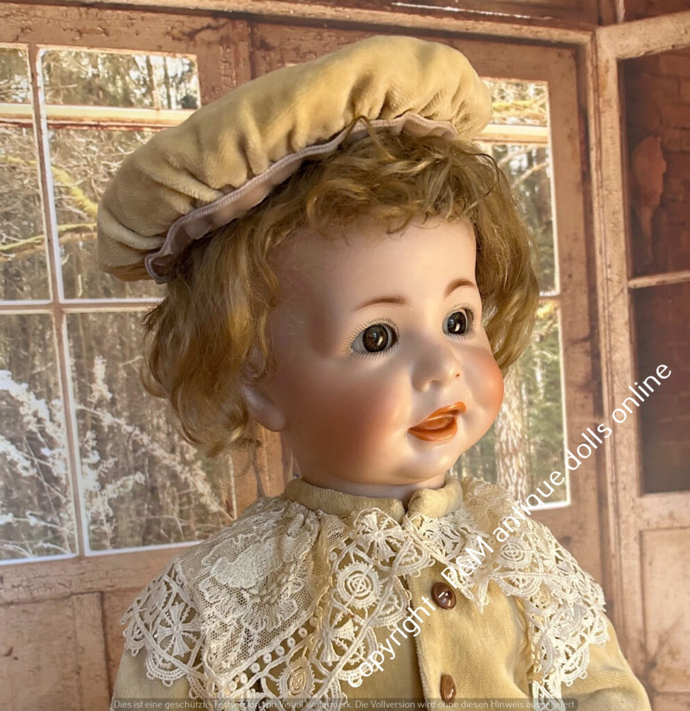 Kämmer & Reinhardt, # 116/A in ~ 22″, open-closed mouth, perfect bisque, brown sleep eyes, orig. pretty wig, very good orig. fully jointed toddler body, old dressed. ~ 1912