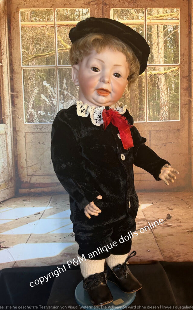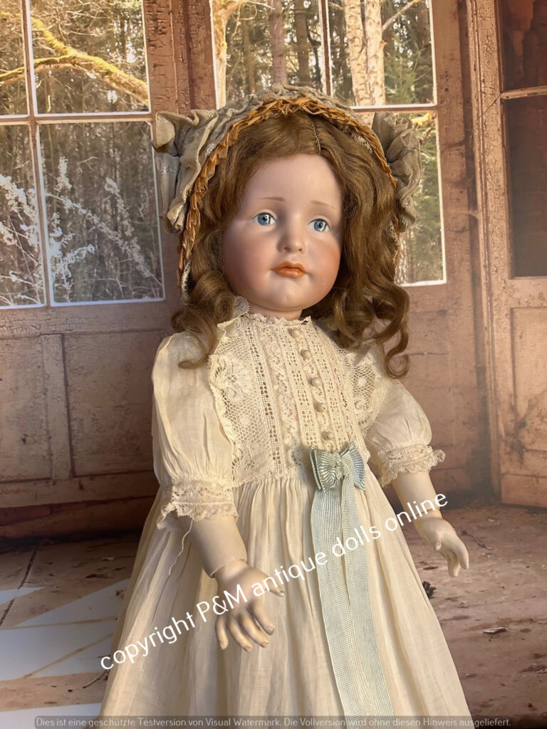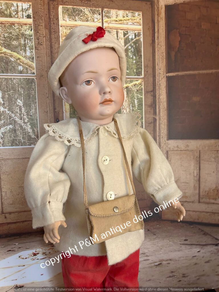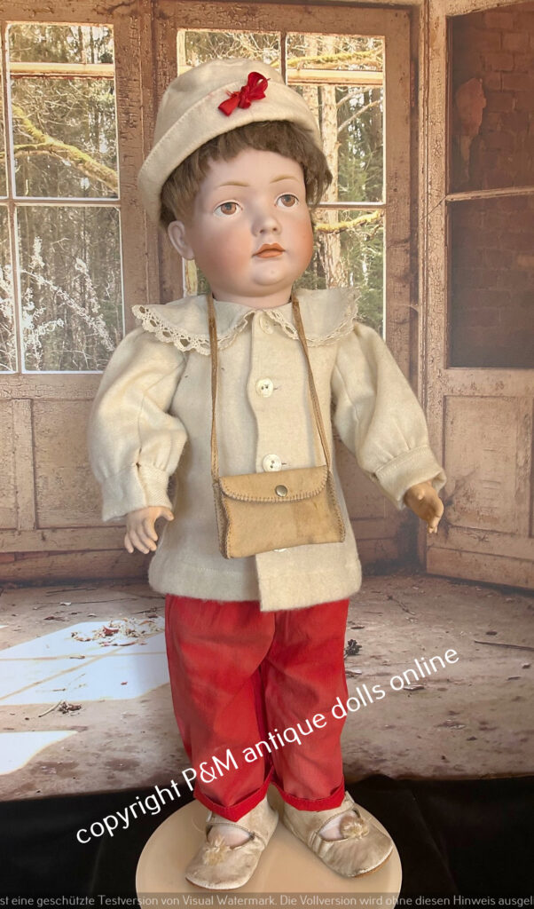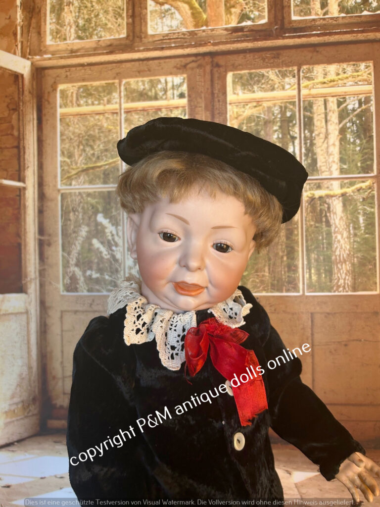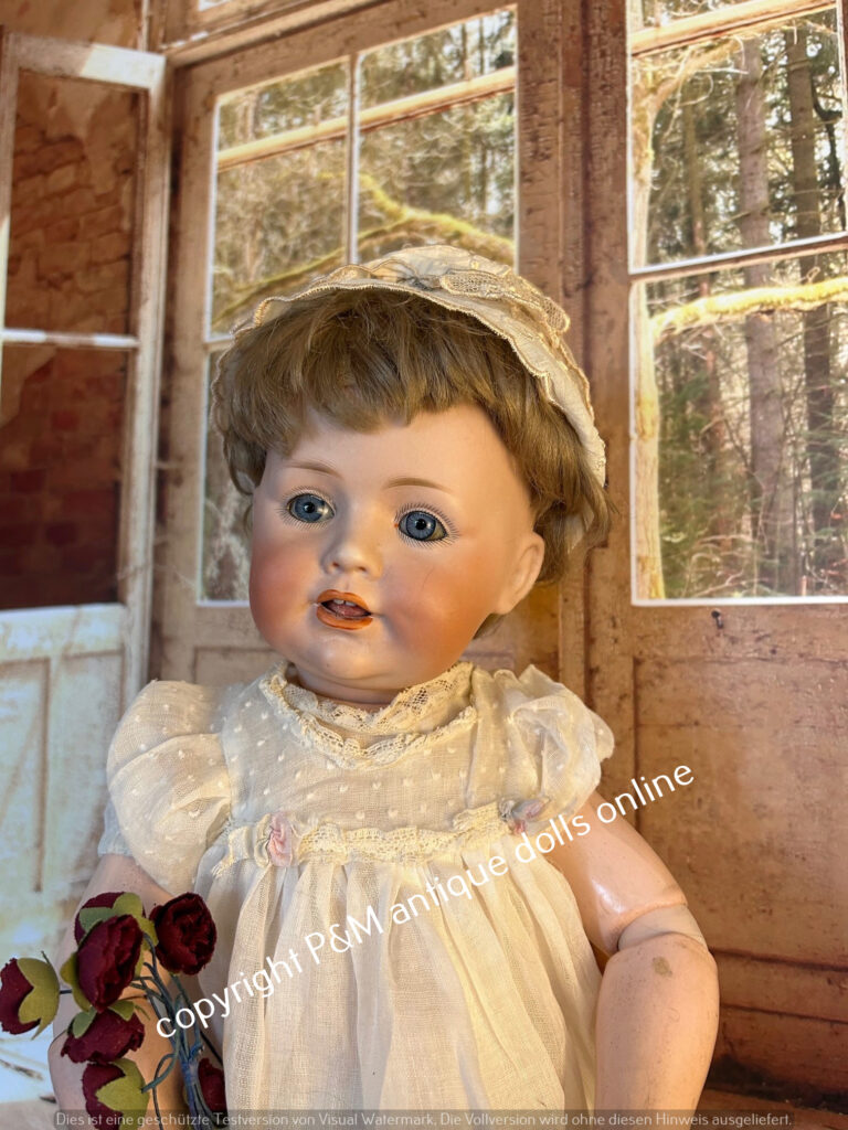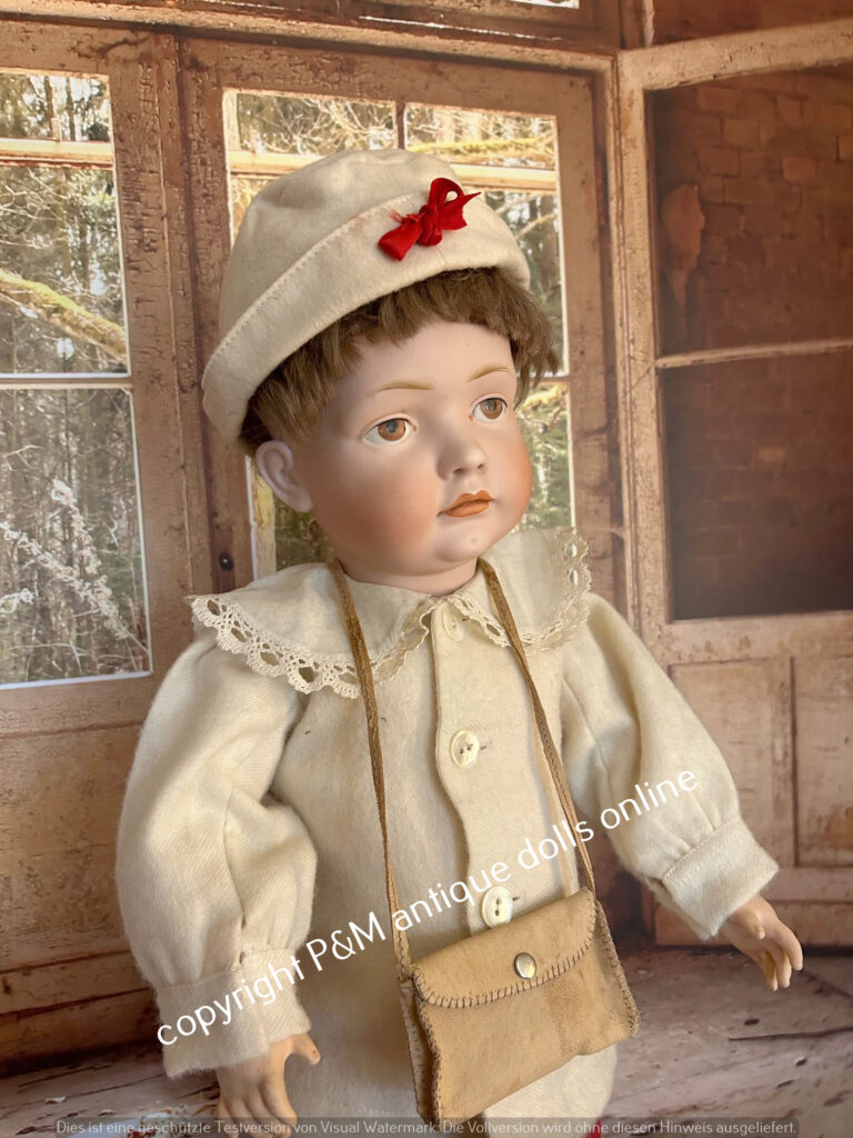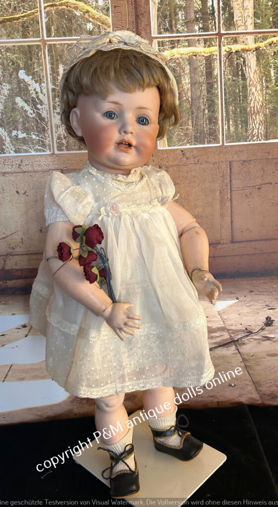 Perfect at all character doll from Kämmer & Reinhardt, # 117/A in ~ 26″, perfect flawless bisque, blue sleep eyes, unbelievable pretty expression, first out of the mold look, orig. wig, orig, top fully jointed body. Antique dressed with antique shoes, ~ 1912. Simply one from the best we have seen in all the years….