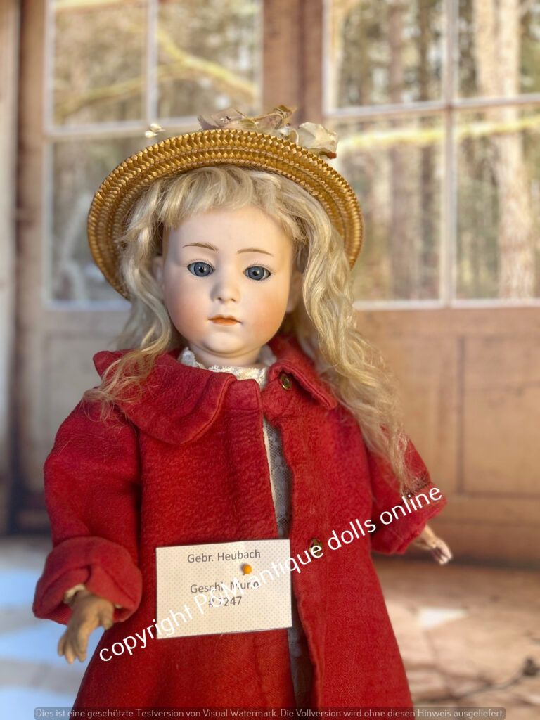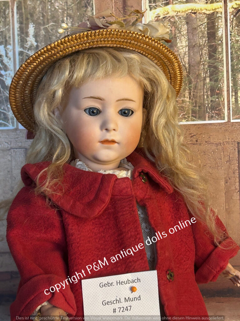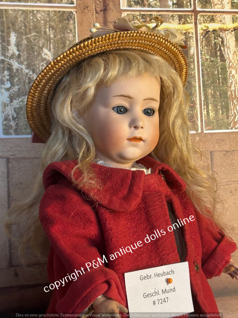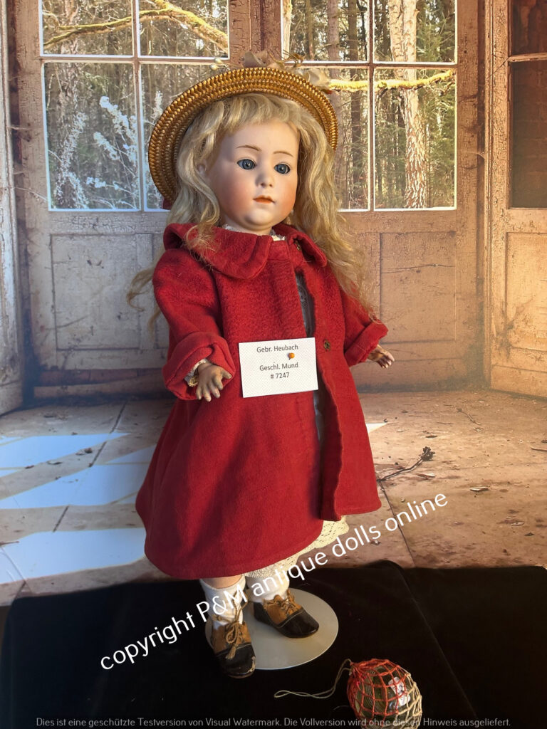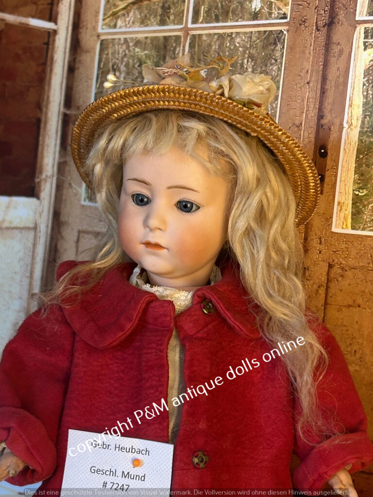 Rare mold number Gebr. Heubach doll, # 7247 in ~ 17″, perfect bisque, blue sleep eyes, mohair wig, good fully jointed body with normal wear, old / antique dressed. ~ 1912