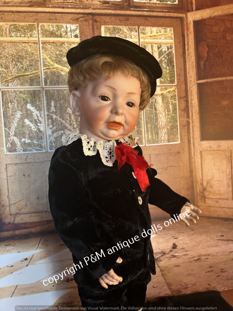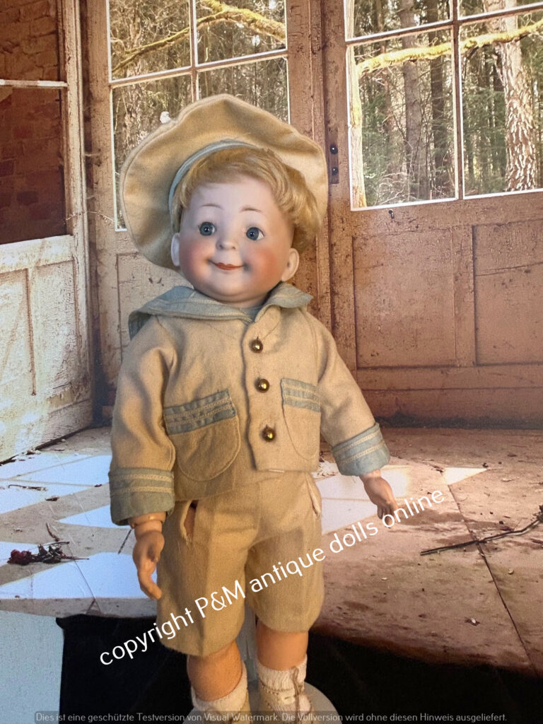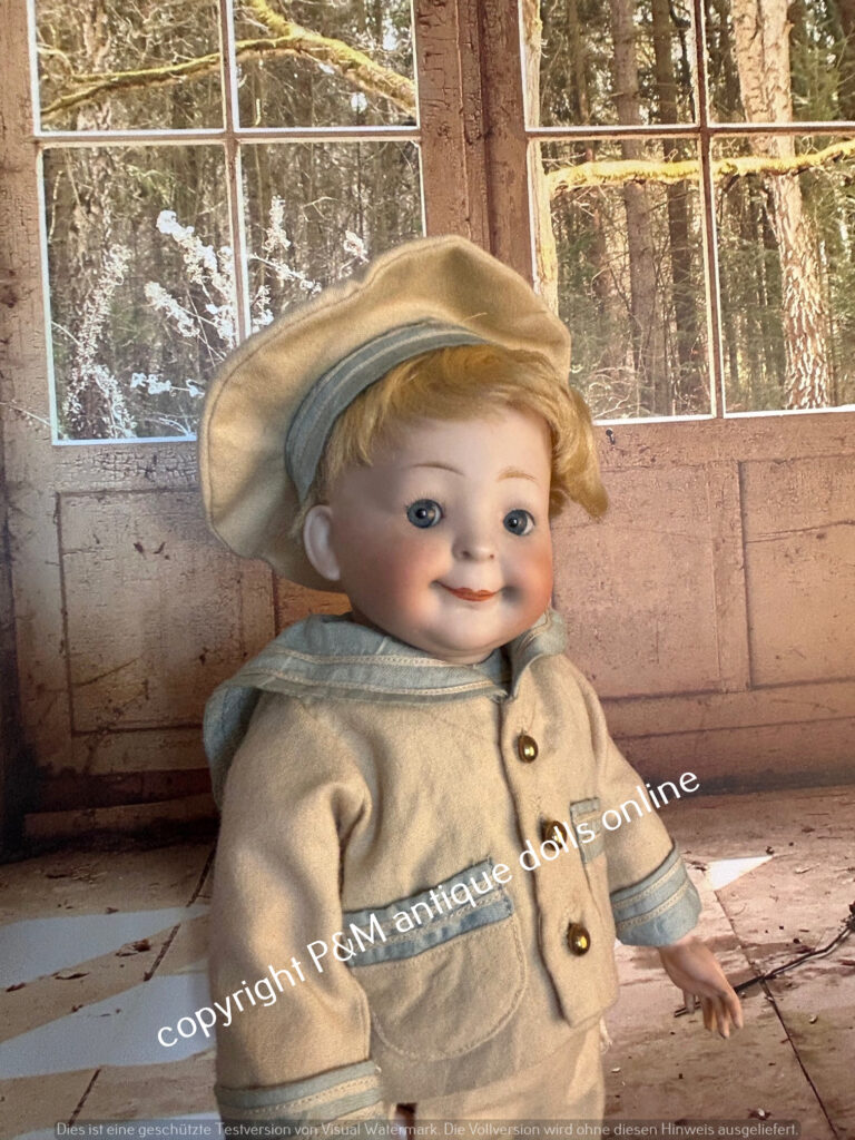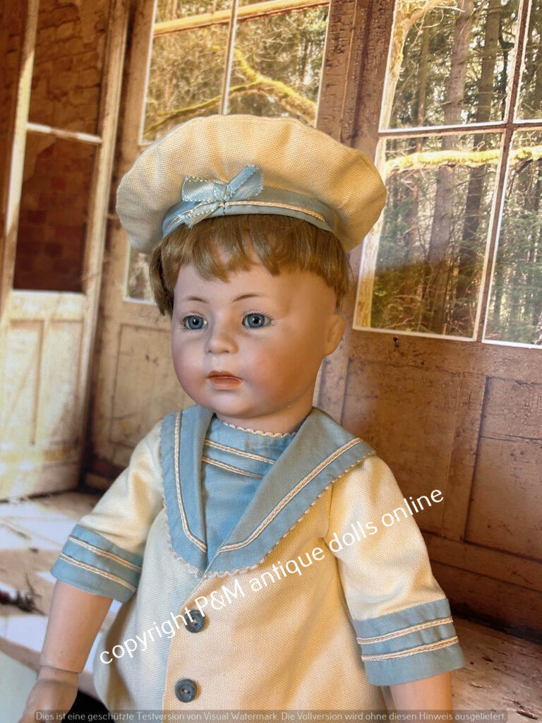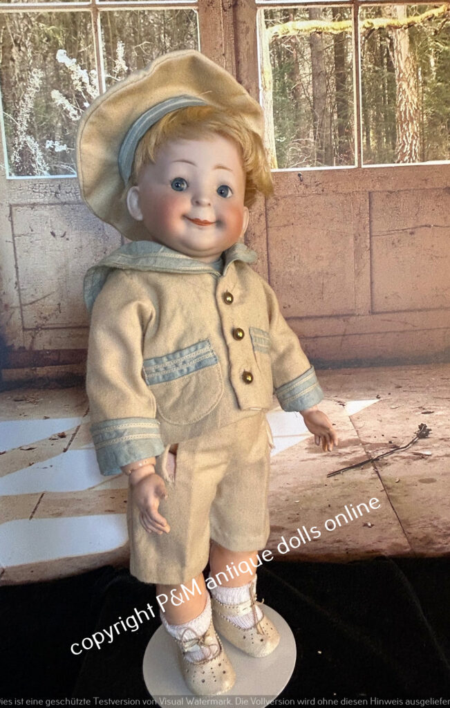 Pretty big and rare Googly from Hertel & Schwab, # 173 in ~ 15″, perfect bisque, bluesleep eyes, orig. wig, orig. very good toddler body, very pretty sailer boy outfit and old shoes, ~ 1912