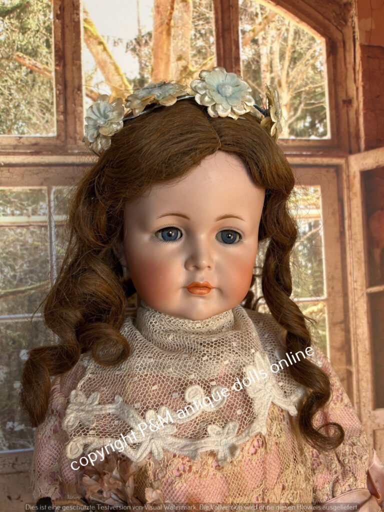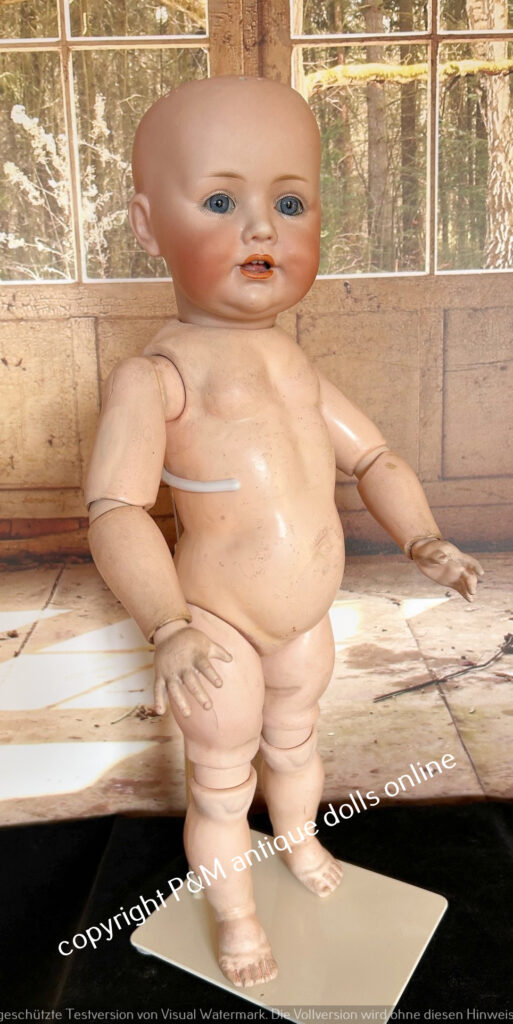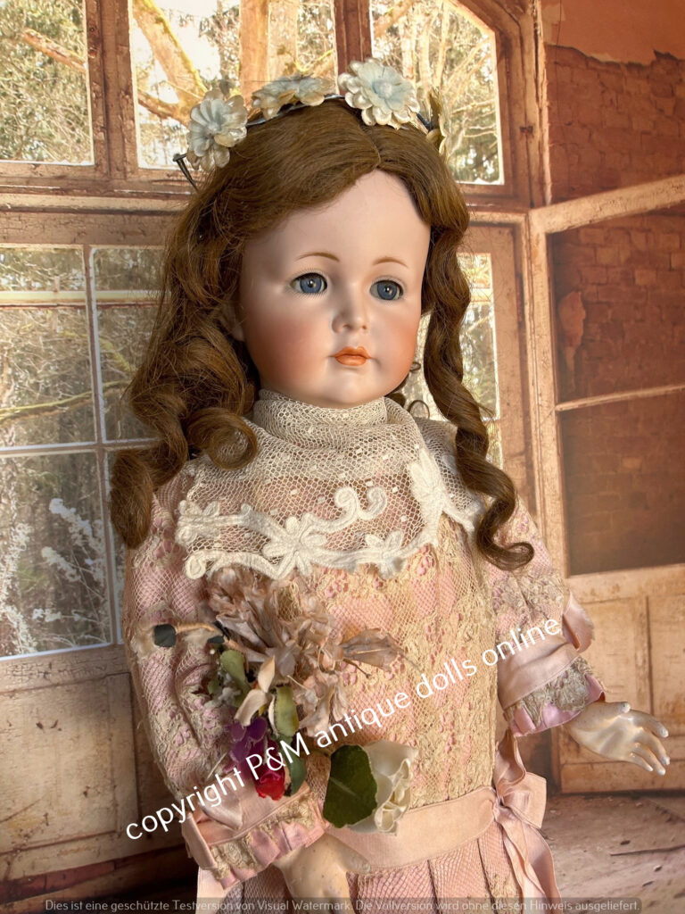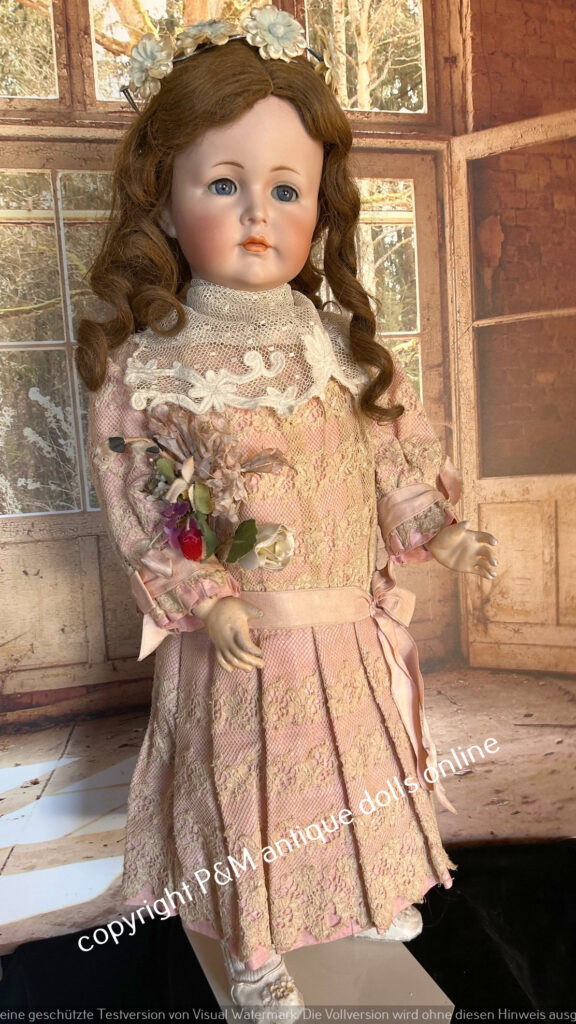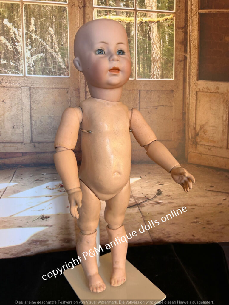 J.D.Kestner, # 247, Hildas sister in ~ 17″, perfect bisque, blue sleep eyes, movabale tongue, orig. plaster pate and orig. wig, very good toddler body, clothes party old / original, antique shoies too, ~ 1912