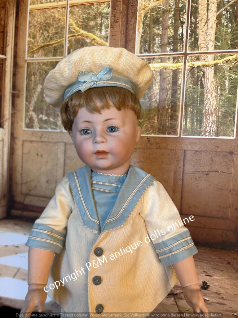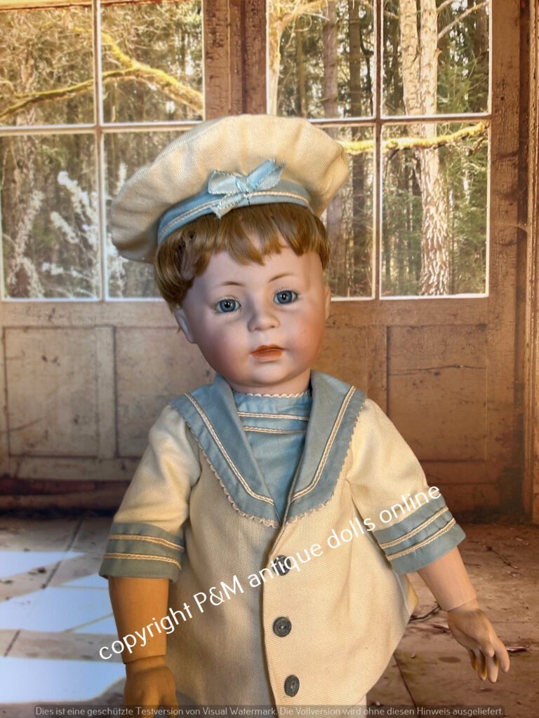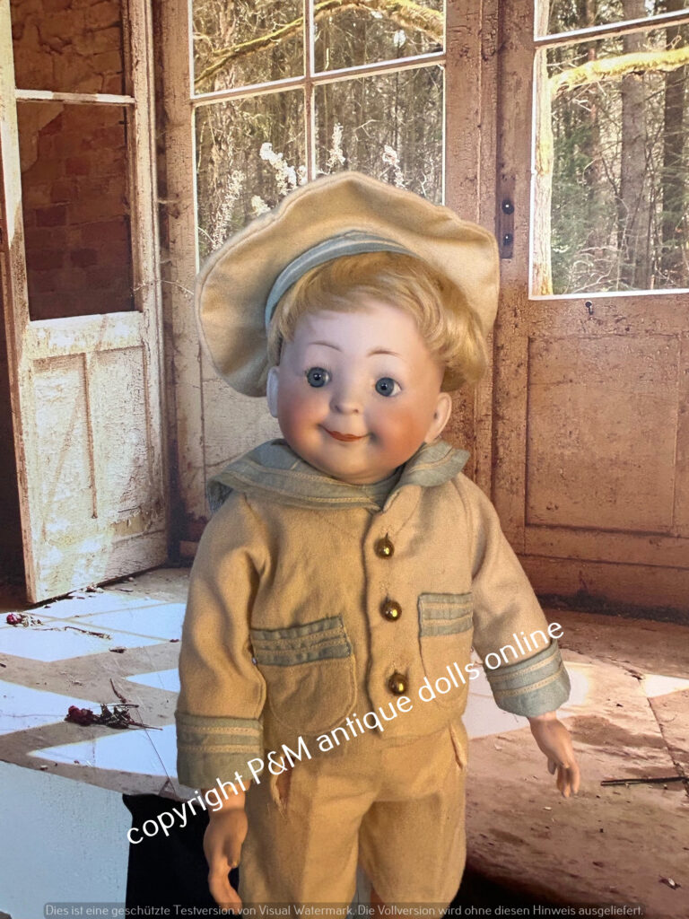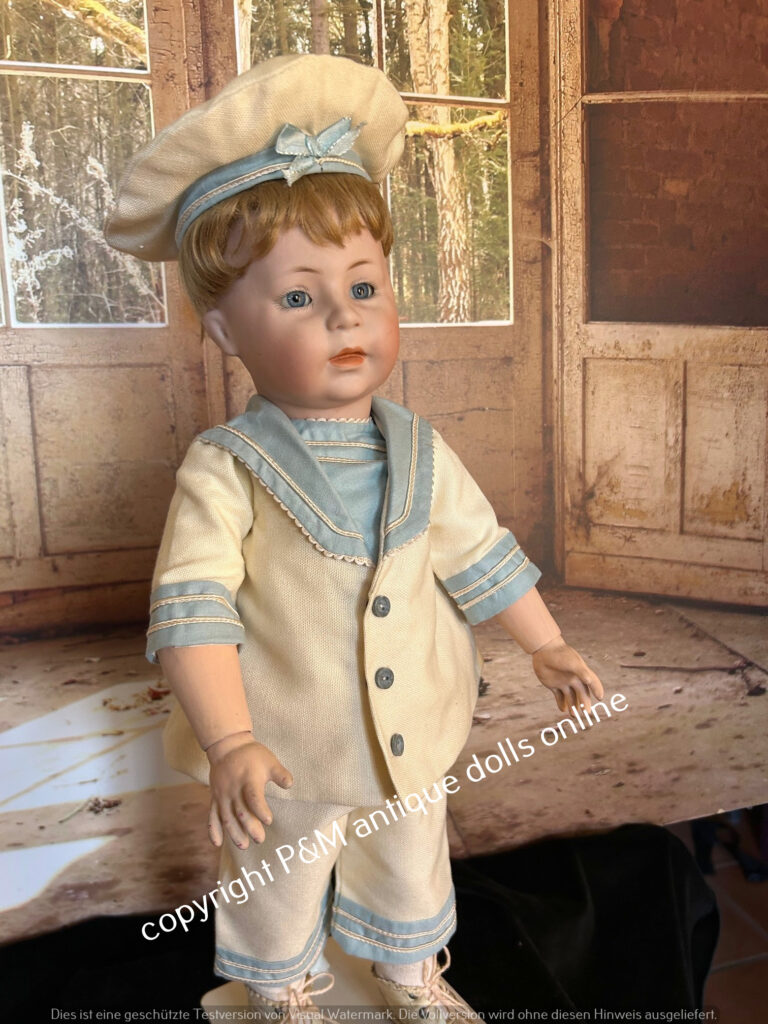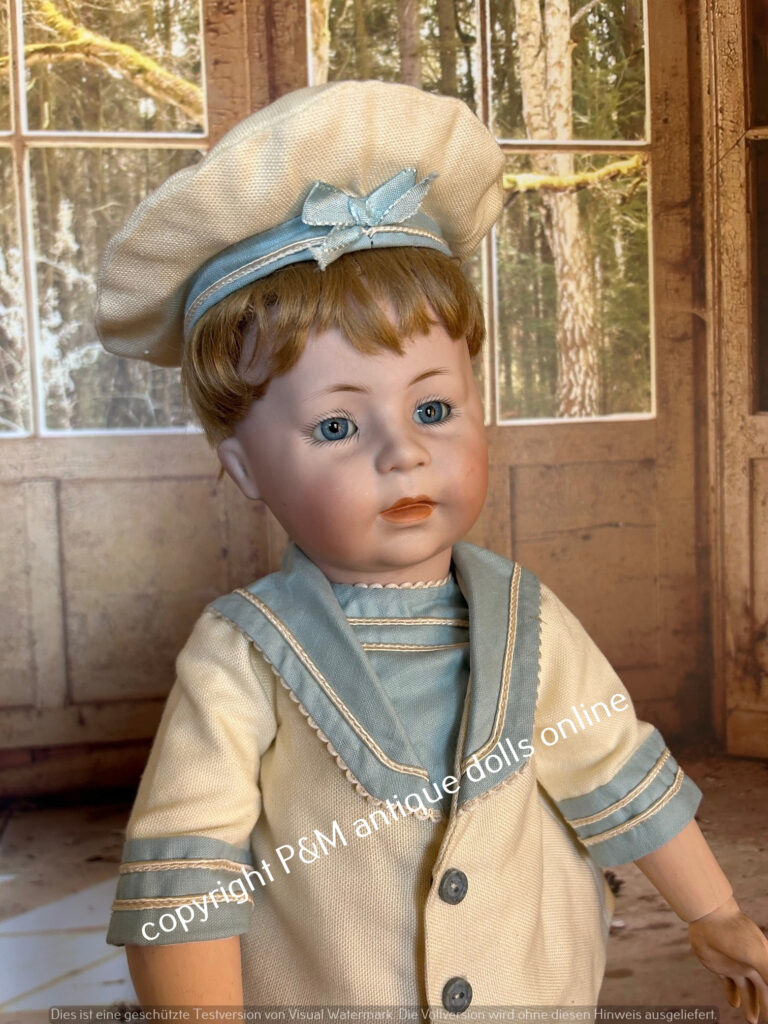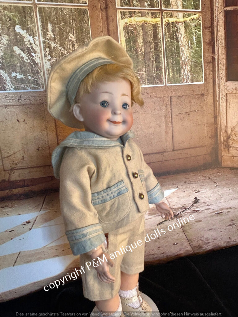 Rare to find character doll from Simon & Halbig, # 1488 in ~ 17″, flawless bisque, blue sleep eyes, orig. wig, very pretty dressad as a sailor, antique shoes, ~ 1915