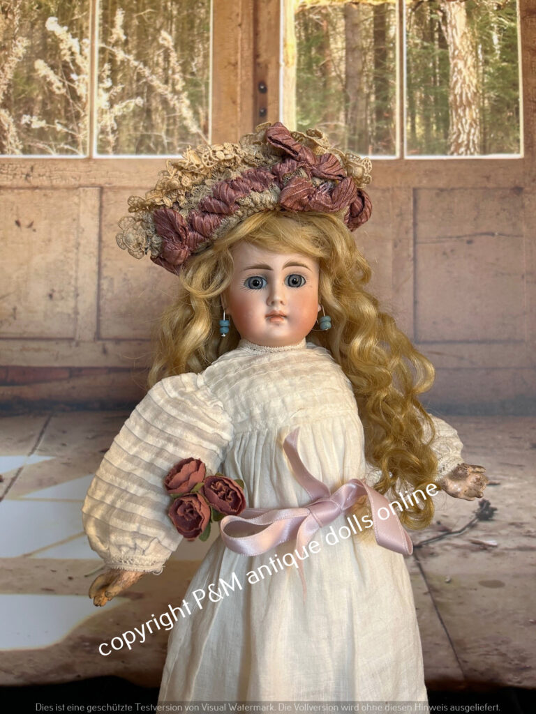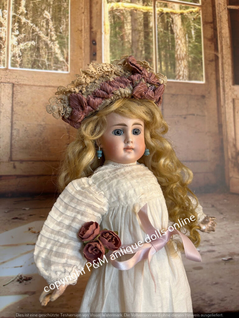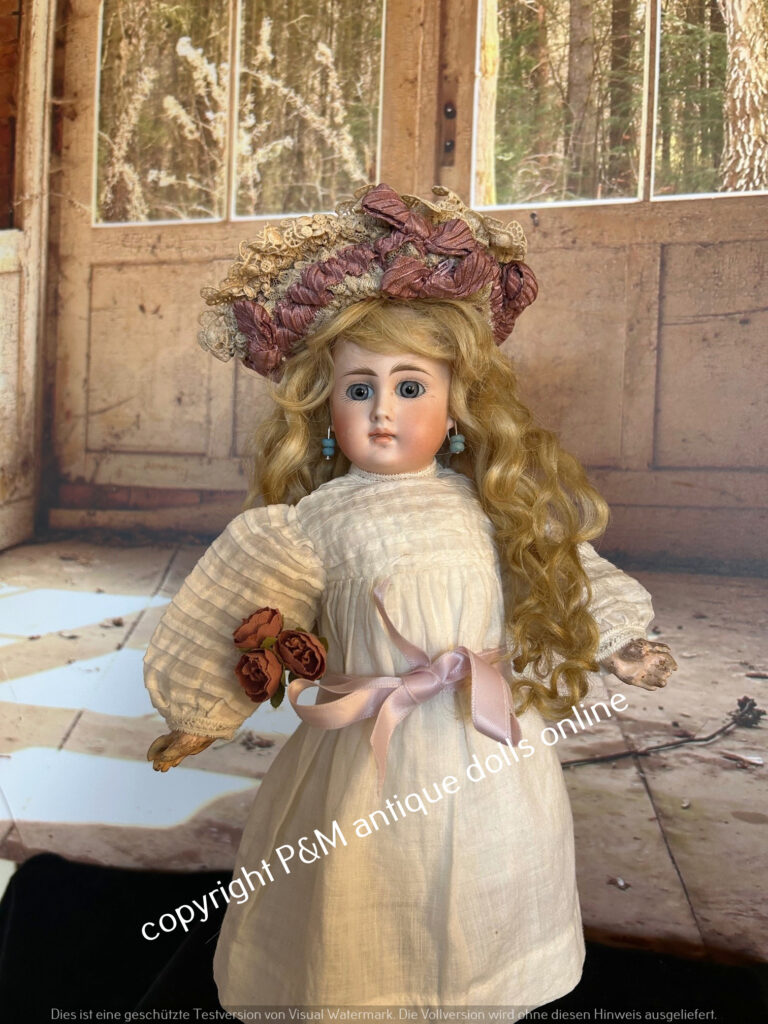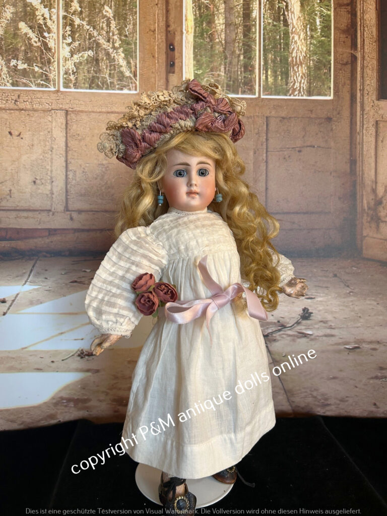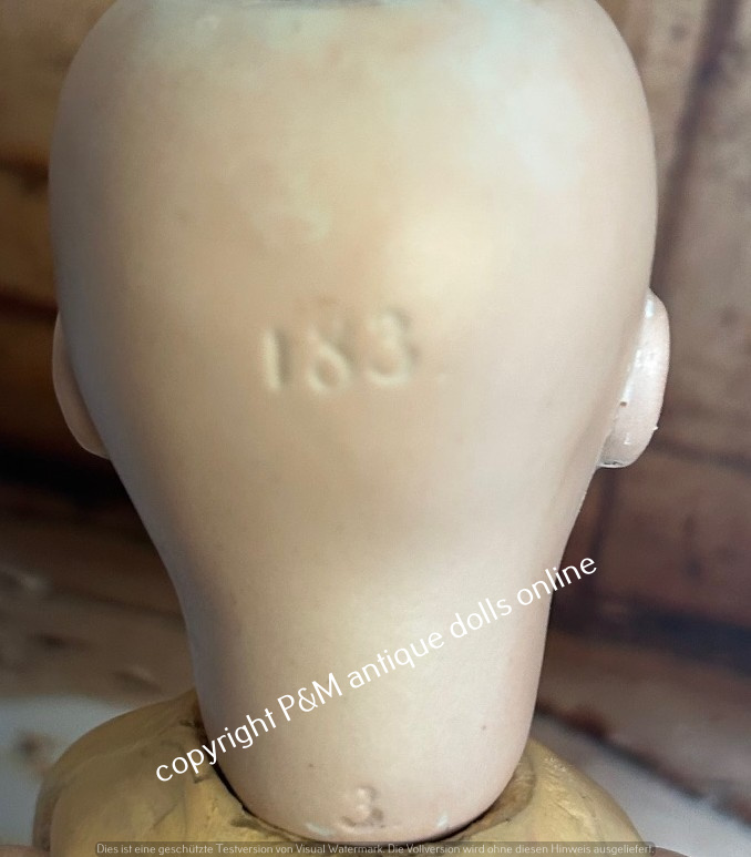Early Belton doll in only ~ 11 1/2″, marked : 183. Perfect bisque head, blue paperweight eyes, mohair wig, orig. early straight wrist body in played with conditions, antique dress, hat and shoes. ~ 1888